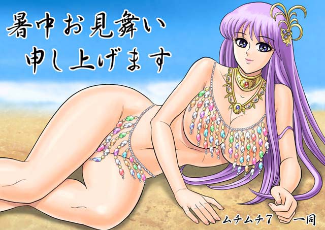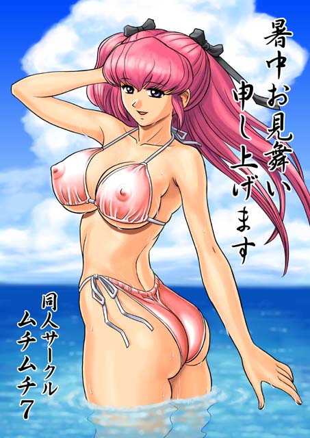 2000年の暑中見舞い用に描いたものです。白い水着がなんともかすみぽくって良いし、何よりも水着の透け具合がたまりませんね! シチュエーションは兄、疾風に自分の水着姿を見せて記憶を戻そうとしている所です・・・疾風、うらやましすぎ(笑) ちなみに、ムチムチ7の初代トップ絵にも飾っていました。 |