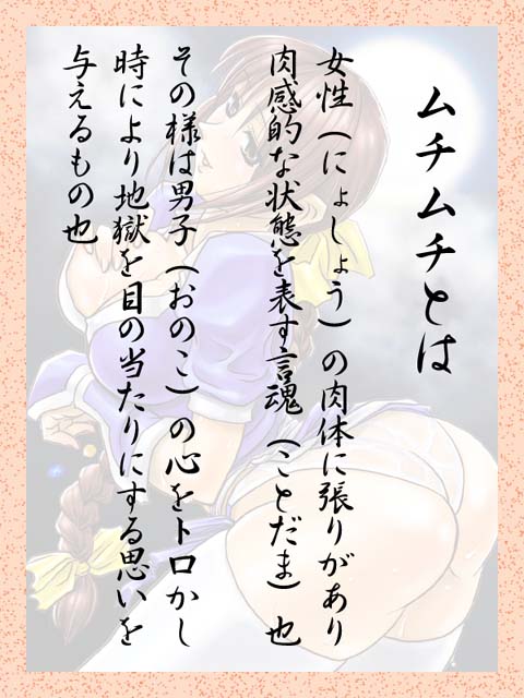 「ムチムチ7」とは「ムチムチ道」を極めんがため「七つの誓い」の下に 結成された「ムチムチ」専門同人結社です。 ※「ムチムチ」「七つの誓い」については下記をご覧ください。 [ムチムチとは] [ムチムチ七つの誓い]